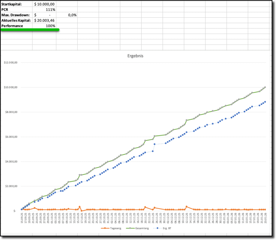 Seit dem Start wurden insgesamt 84 Trades durchgeführt und Stand Freitag, den 23.01.2026 ein Kapitalstand von $20.003 erreicht. Das entspricht einer Verdoppelung des Kapitals in ca. 4,5 Monaten. Die folgende Grafik zeigt den Verlauf der Kapitalkurve im Echtgeldhandel (grün) und im Paper-Trading (blau) sowie die Tagesergebnisse (orange).